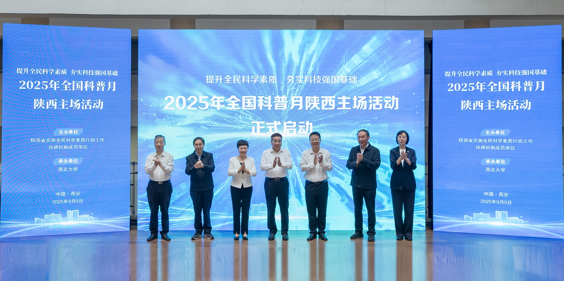 种康院士、康振生院士、杨冠军、蒋林、李豫琦、李肇娥、高红霞共同开启了2025年陕西科普月活动。