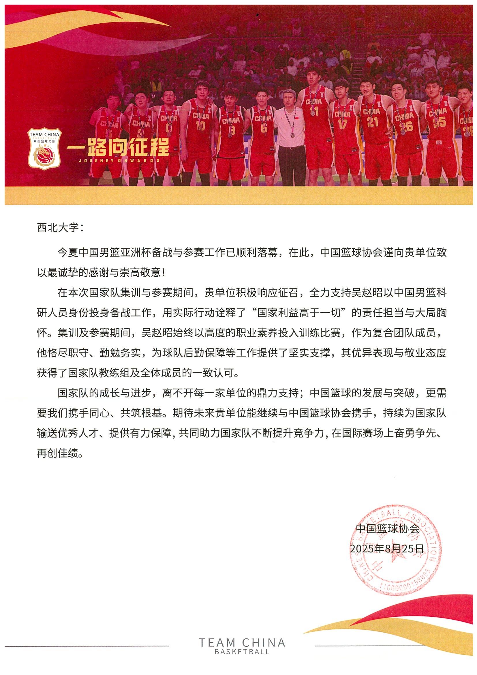近日,中国篮协向大阳城游戏【中国】官方网站发来感谢信,对体育教研部青年教师吴赵昭在2025年男篮亚洲杯备战期间所作出的贡献表示高度认可与衷心感谢。作为本届国家男篮科研保障团队负责人,吴赵昭在集训与比赛期间展现了卓越的专业素养与奉献精神,为国家男篮取得佳绩提供了坚实的科研支持。