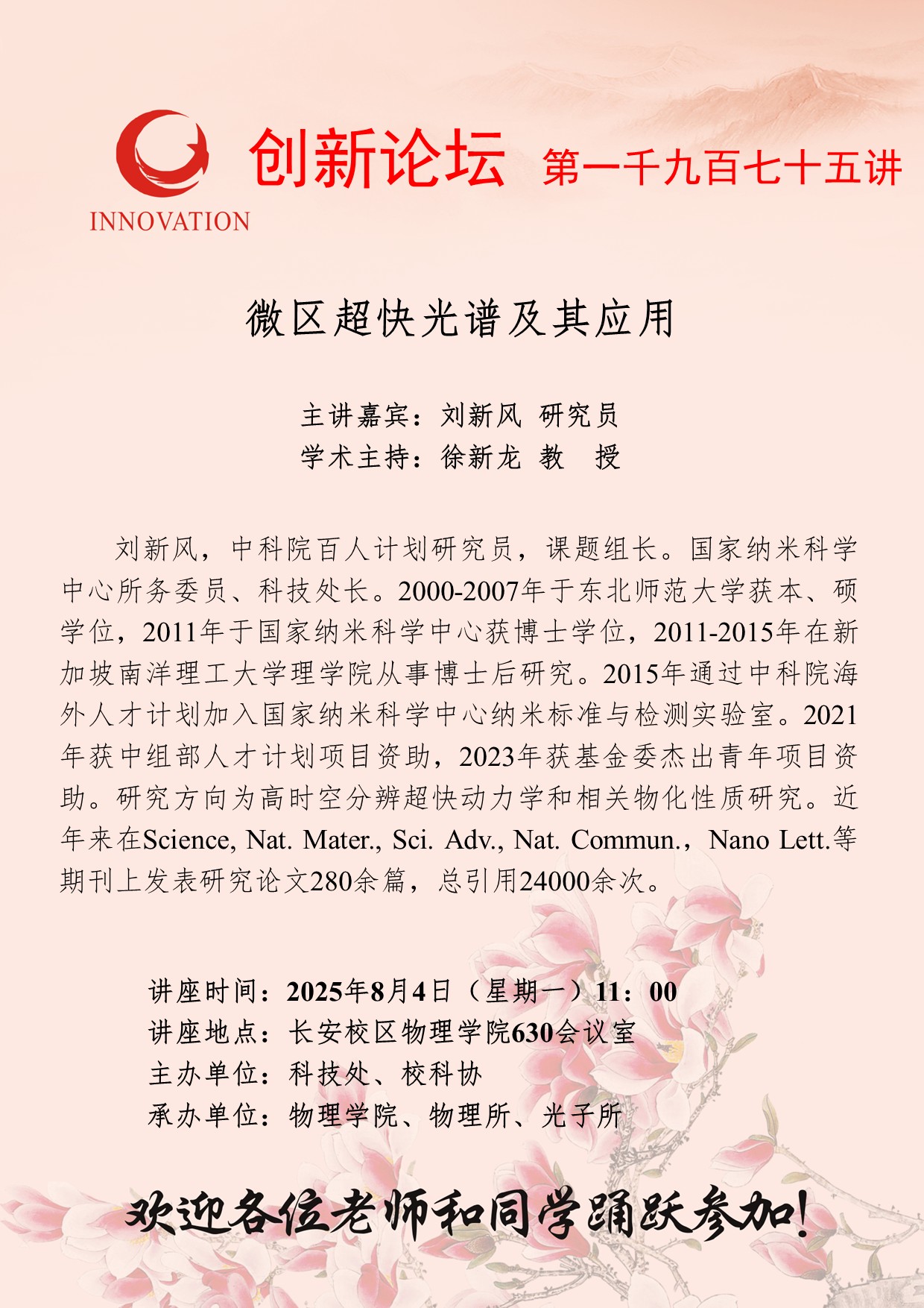 刘新风 研究员 大阳城游戏【中国】官方网站创新论坛第一千九百七十五讲:微区超快光谱及其应用 讲座时间 2025年8月4日(星期一) 讲座地点 长安校区物理学院630会议室 讲座人介绍 刘新风 研究员 讲座内容