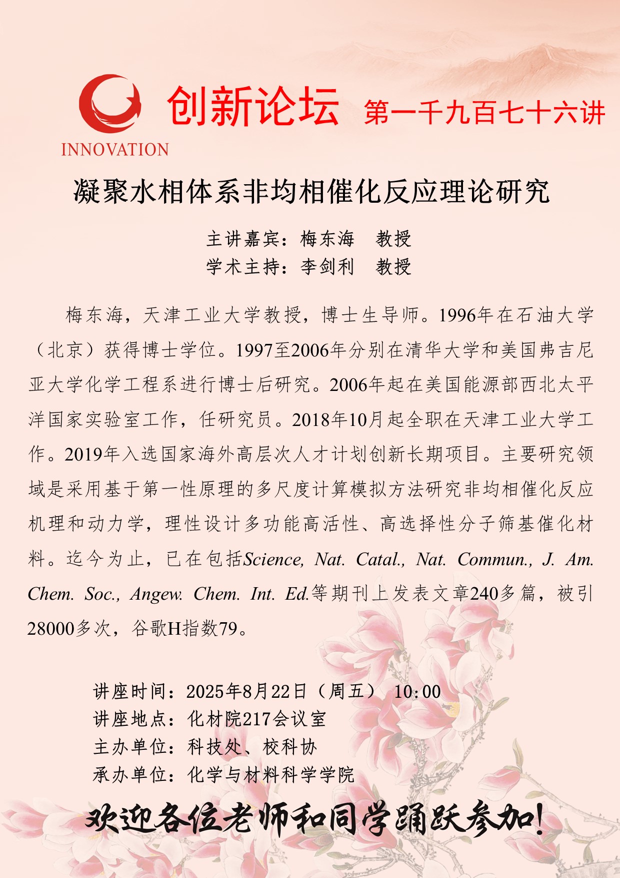 梅东海 教授 大阳城游戏【中国】官方网站创新论坛第一千九百七十六讲:凝聚水相体系非均相催化反应理论研究 讲座时间 2025年8月22日(星期五) 10:00 讲座地点 化材学院217智慧教室 讲座人介绍 梅东海 教授 讲座内容