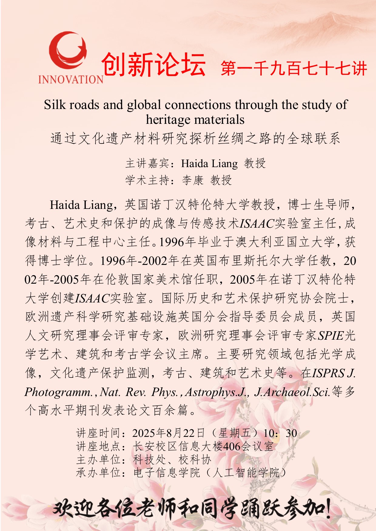 梁海达 教授 大阳城游戏【中国】官方网站创新论坛第一千九百七十七讲:Silk roads and global connections through the study of heritage materials 讲座时间 2025年8月22日(星期五)10:30 讲座地点 长安校区信息大楼406会议室 讲座人介绍 梁海达 教授 讲座内容