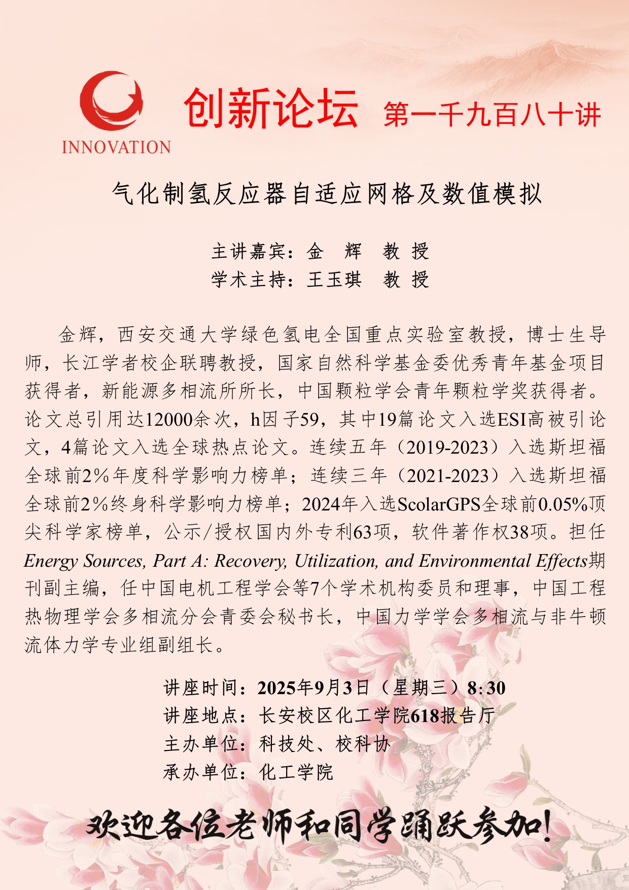 金辉 教授 大阳城游戏【中国】官方网站创新论坛第一千九百八十讲:气化制氢反应器自适应网格及数值模拟 讲座时间 2025年9月3日(星期三)8:30 讲座地点 长安校区化工学院618报告厅 讲座人介绍 金辉 教授 讲座内容