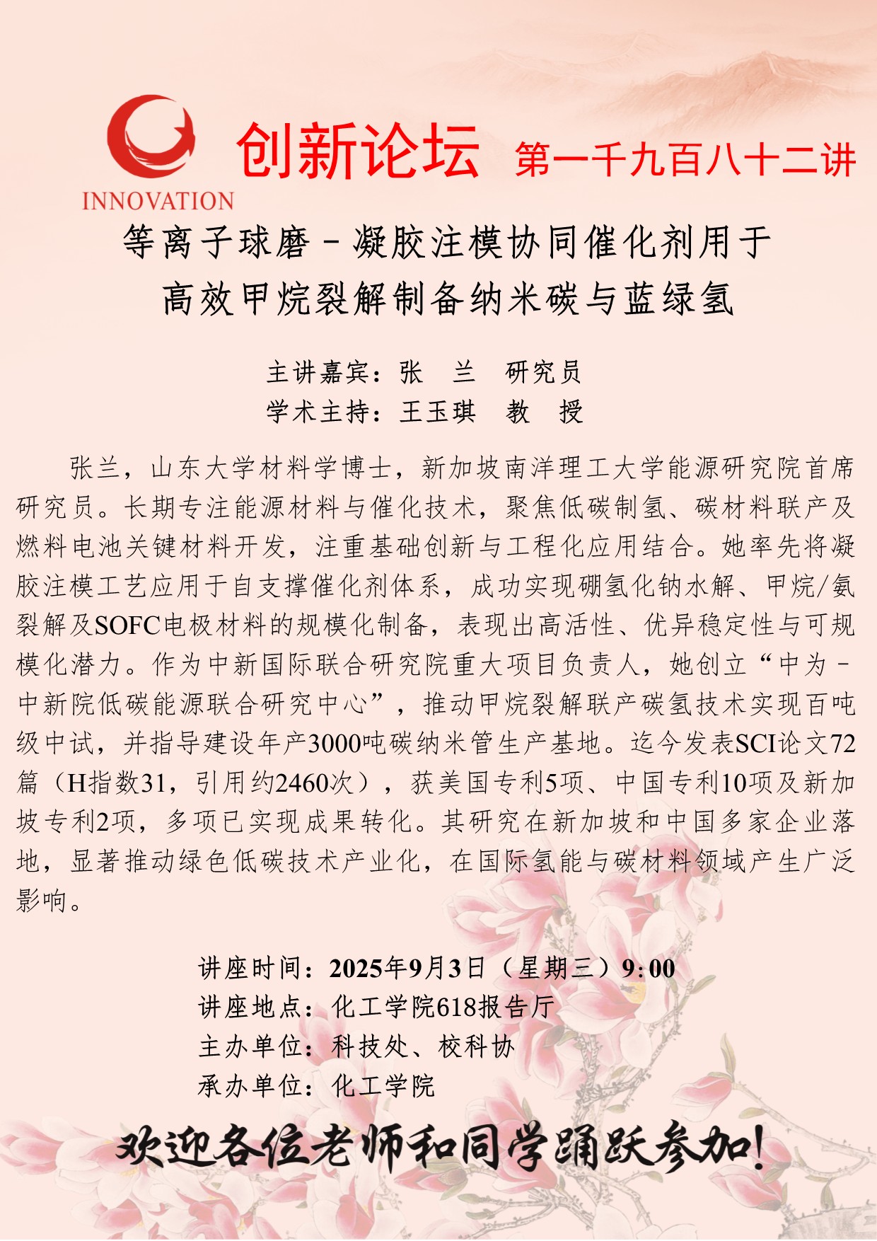 张兰 研究员 大阳城游戏【中国】官方网站创新论坛第一千九百八十二讲:等离子球磨–凝胶注模协同催化剂用于高效甲烷裂解制备纳米碳与蓝绿氢 讲座时间 2025年9月3日(星期三)9:00 讲座地点 化工学院618报告厅 讲座人介绍 张兰 研究员 讲座内容