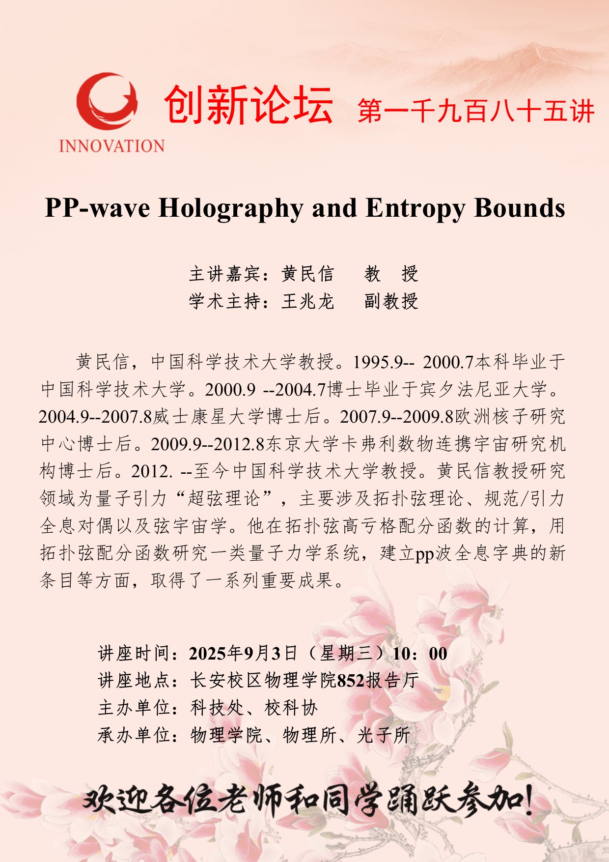 黄民信 教授 大阳城游戏【中国】官方网站创新论坛第一千九百八十五讲:PP-wave Holography and Entropy Bounds 讲座时间 2025年9月3日(星期三)10:00 讲座地点 长安校区物理学院852报告厅 讲座人介绍 黄民信 教授 讲座内容