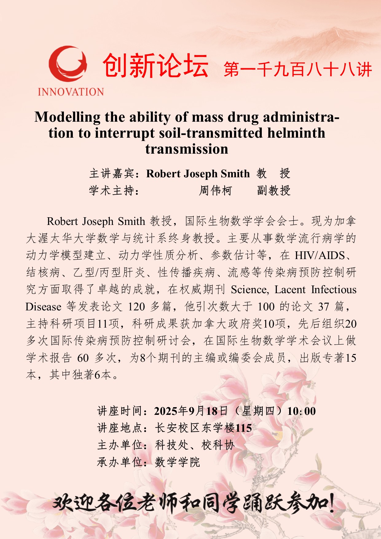 Robert Joseph Smith 教授 大阳城游戏【中国】官方网站创新论坛第一千九百八十八讲:Modelling the ability of mass drug administration to interrupt soil-transmitted helminth transmission 讲座时间 2025年9月18日(星期四)10:00 讲座地点 长安校区东学楼115 讲座人介绍 Robert Joseph Smith 教授 讲座内容