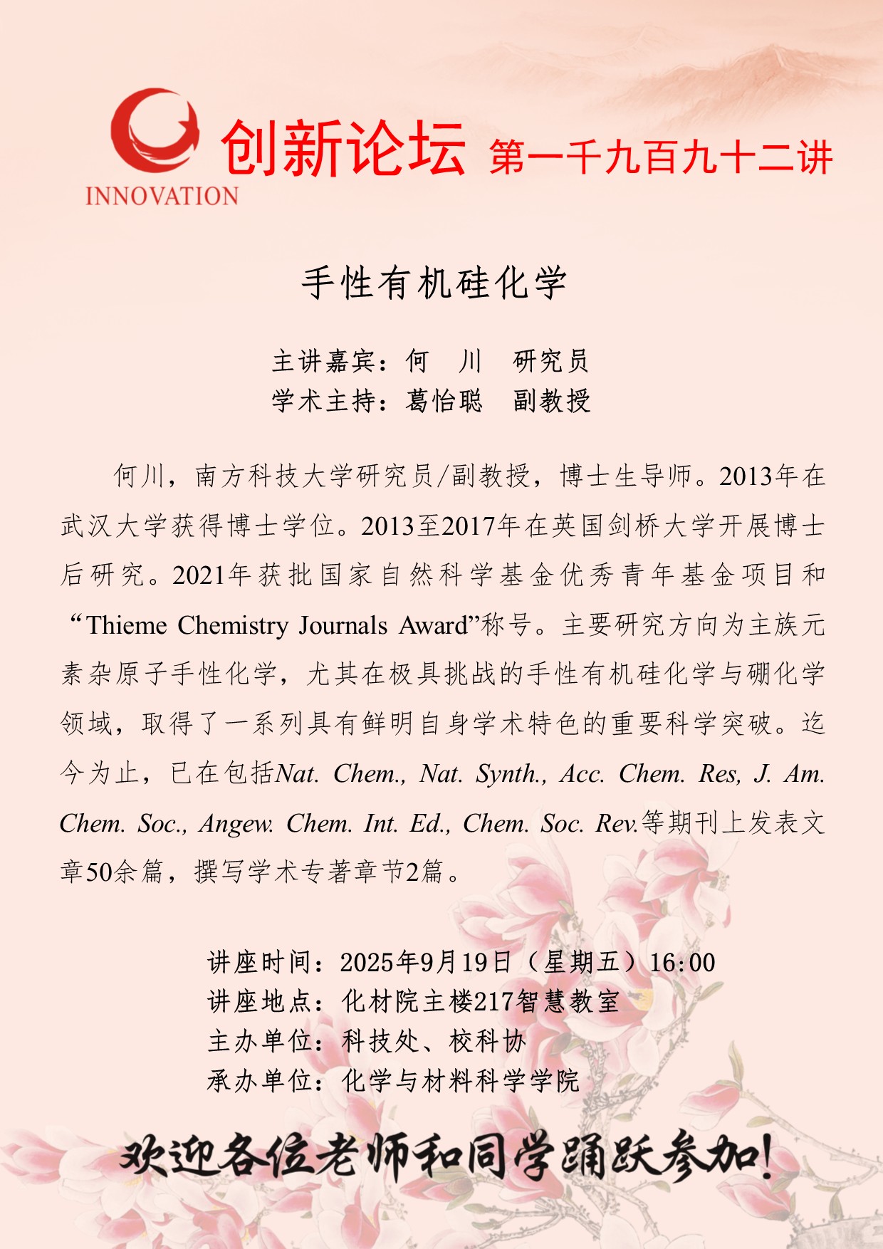 何川 研究员 大阳城游戏【中国】官方网站创新论坛第一千九百九十二讲:手性有机硅化学 讲座时间 2025年9月19日(星期五)16:00 讲座地点 化材院主楼217智慧教室 讲座人介绍 何川 研究员 讲座内容