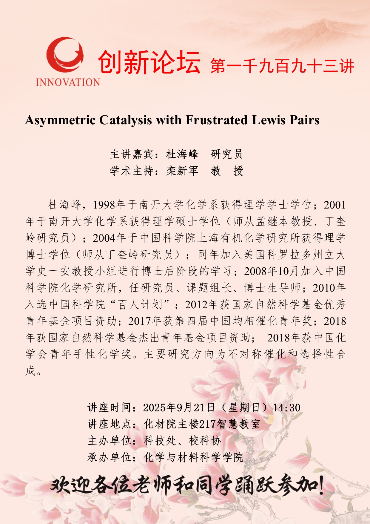 杜海峰 研究员 大阳城游戏【中国】官方网站创新论坛第一千九百九十三讲:Asymmetric Catalysis with Frustrated Lewis Pairs 讲座时间 2025年9月21日(星期日)14:30 讲座地点 化材院主楼217智慧教室 讲座人介绍 杜海峰 研究员 讲座内容