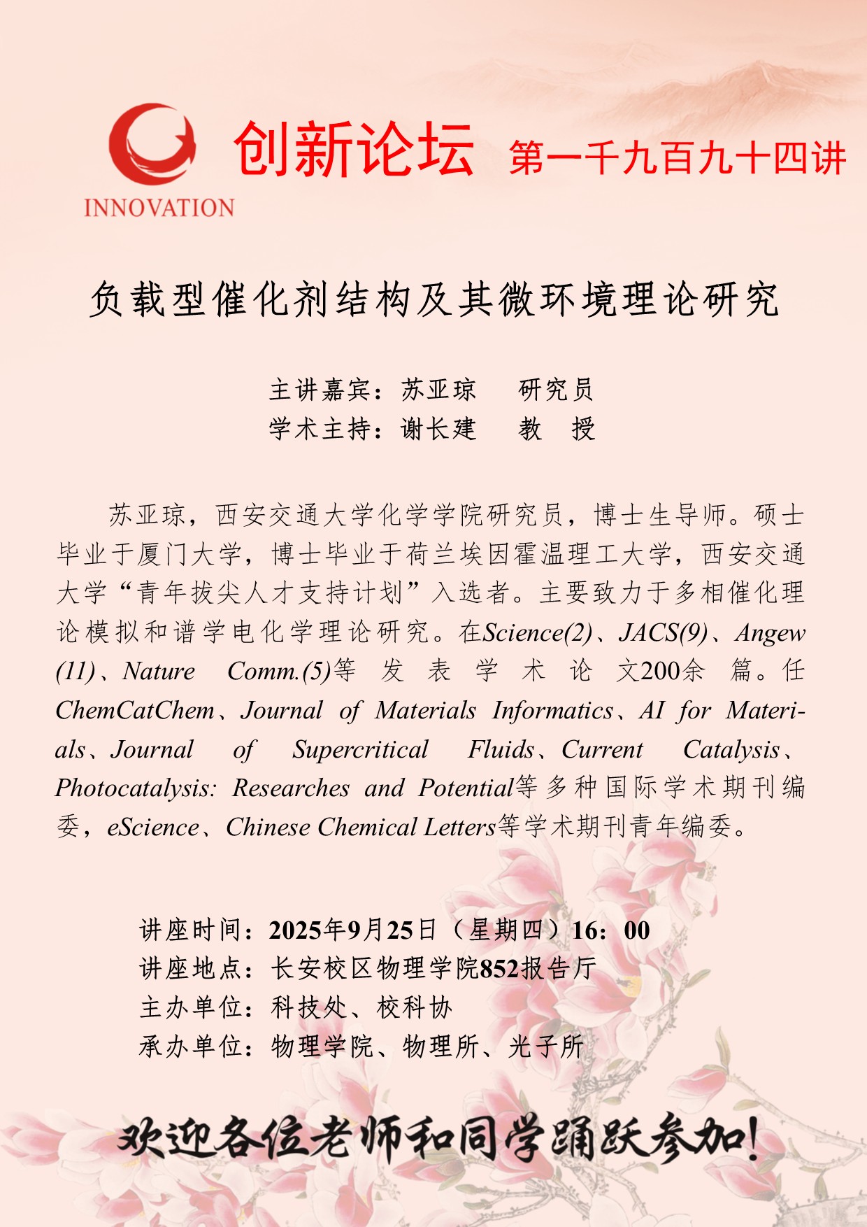 苏亚琼 研究员 大阳城游戏【中国】官方网站创新论坛第一千九百九十四讲:负载型催化剂结构及其微环境理论研究 讲座时间 2025年9月25日(星期四)16:00 讲座地点 长安校区物理学院852报告厅 讲座人介绍 苏亚琼 研究员 讲座内容