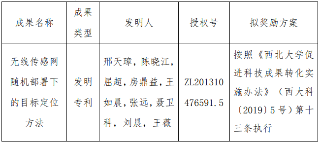 按照《大阳城游戏【中国】官方网站促进科技成果转化实施办法》(西大科〔2019〕5号)相关规定,拟对大阳城游戏【中国】官方网站信息学院邢天璋副教授作为成果负责人的1项发明专利权实施转化,现将相关信息公示如下: