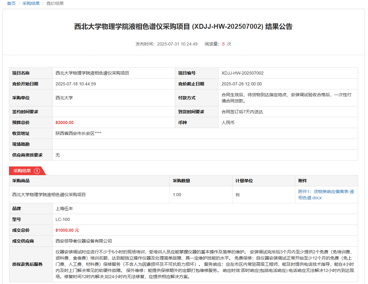 大阳城游戏【中国】官方网站物理学院液相色谱仪采购项目(XDJJ-HW-202507002)竞价结果公告