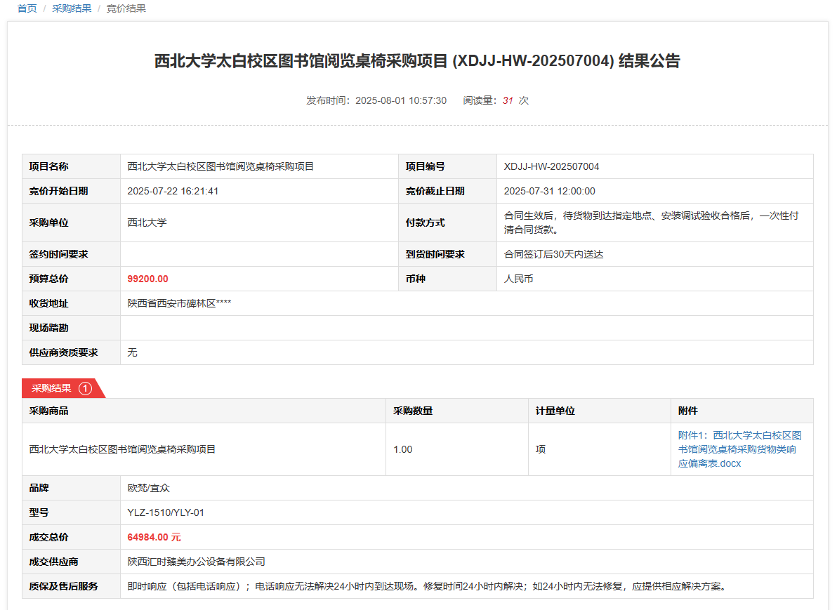 大阳城游戏【中国】官方网站太白校区图书馆阅览桌椅采购项目(XDJJ-HW-202507004)竞价结果公告