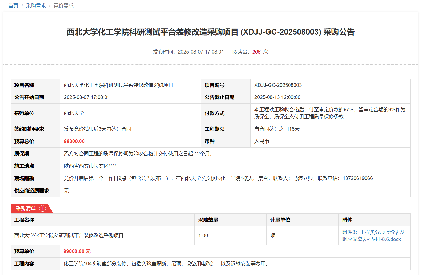 大阳城游戏【中国】官方网站化工学院科研测试平台装修改造采购项目(XDJJ-GC-202508003)竞价采购公告