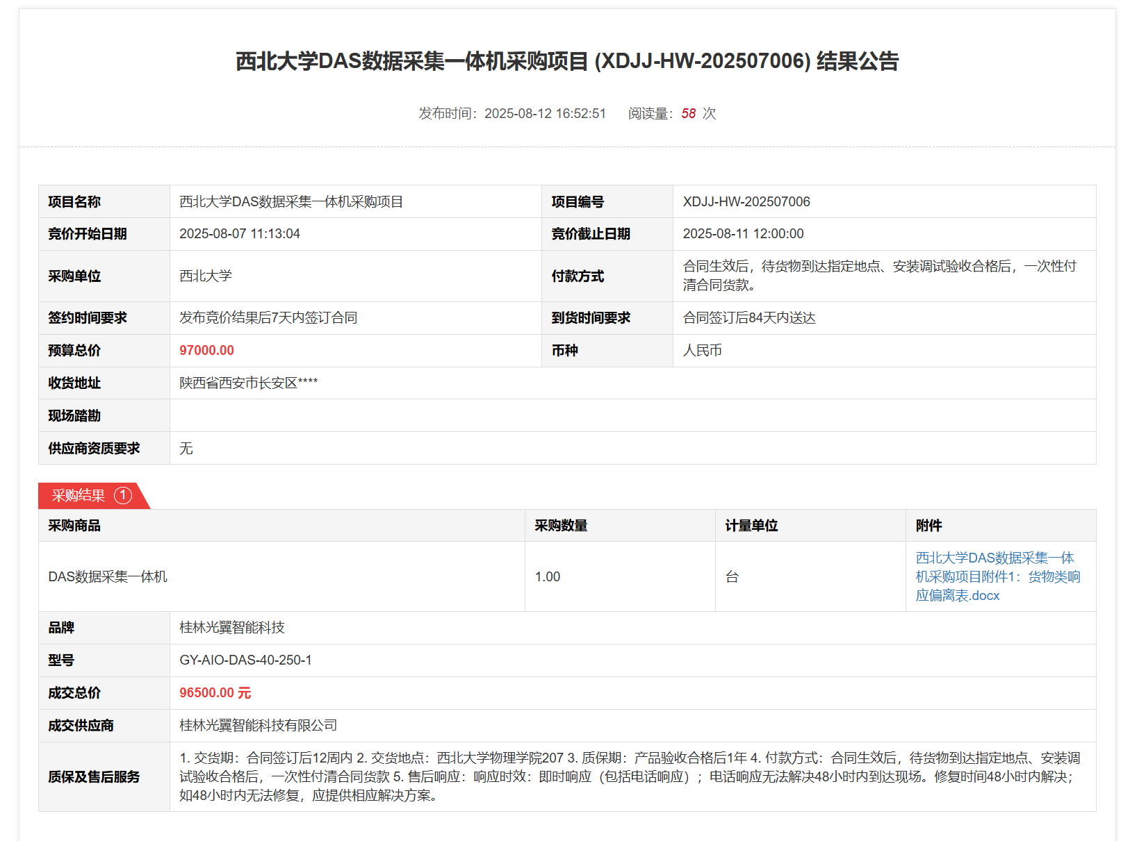 大阳城游戏【中国】官方网站DAS数据采集一体机采购项目(XDJJ-HW-202507006)竞价结果公告