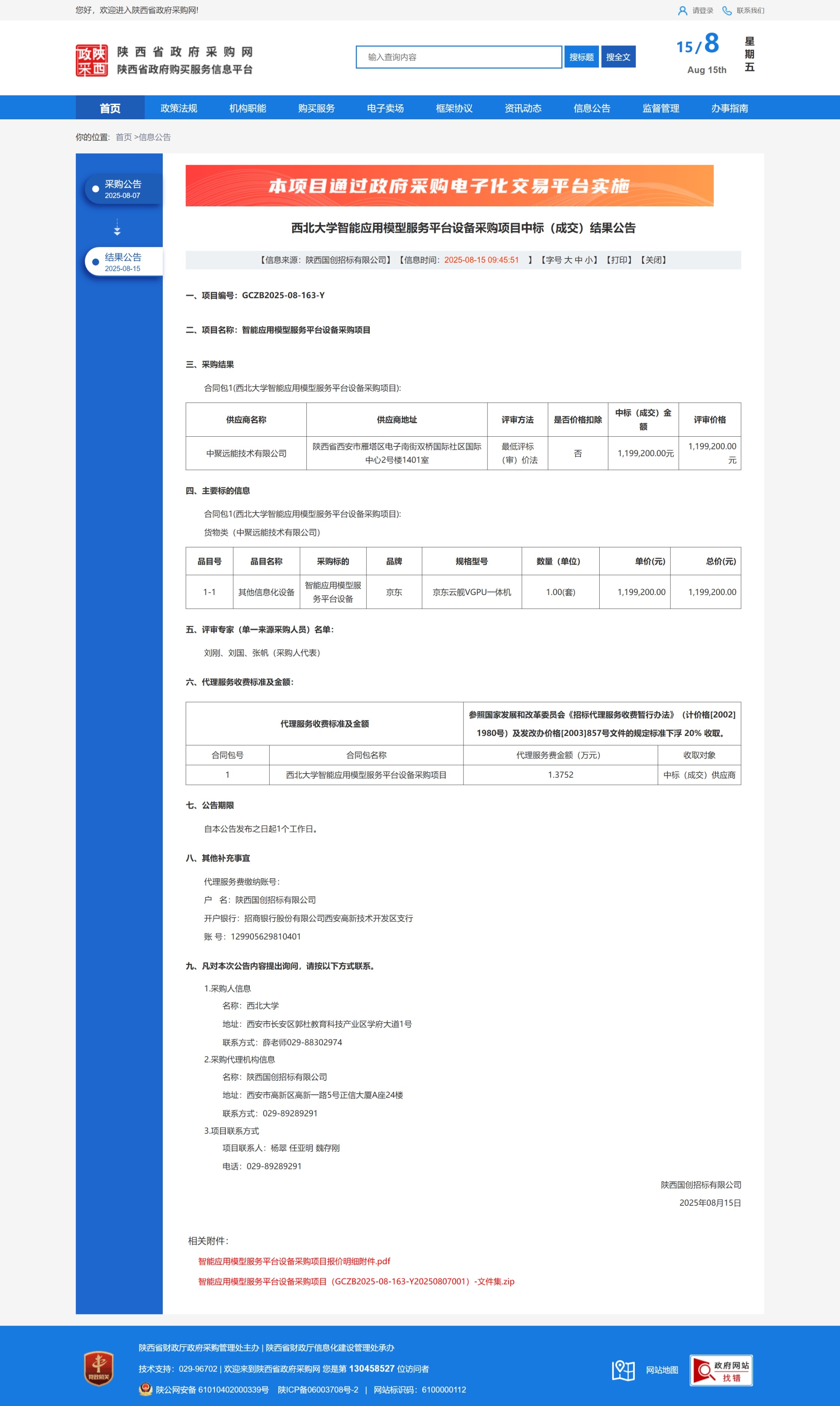 大阳城游戏【中国】官方网站智能应用模型服务平台设备采购项目中标(成交)结果公告 作者: 编辑:采购与招标办公室 时间:2025-08-15 原公告链接:https://www.ccgp-shaanxi.gov.cn/freecms/site/shaanxi/ggxx/info/2025/8a69c4d59860f6420198ab5332c37fcf.html?noticeType=001023¬iceId=a3a64a26-797b-11f0-8063-08c0eb20c666