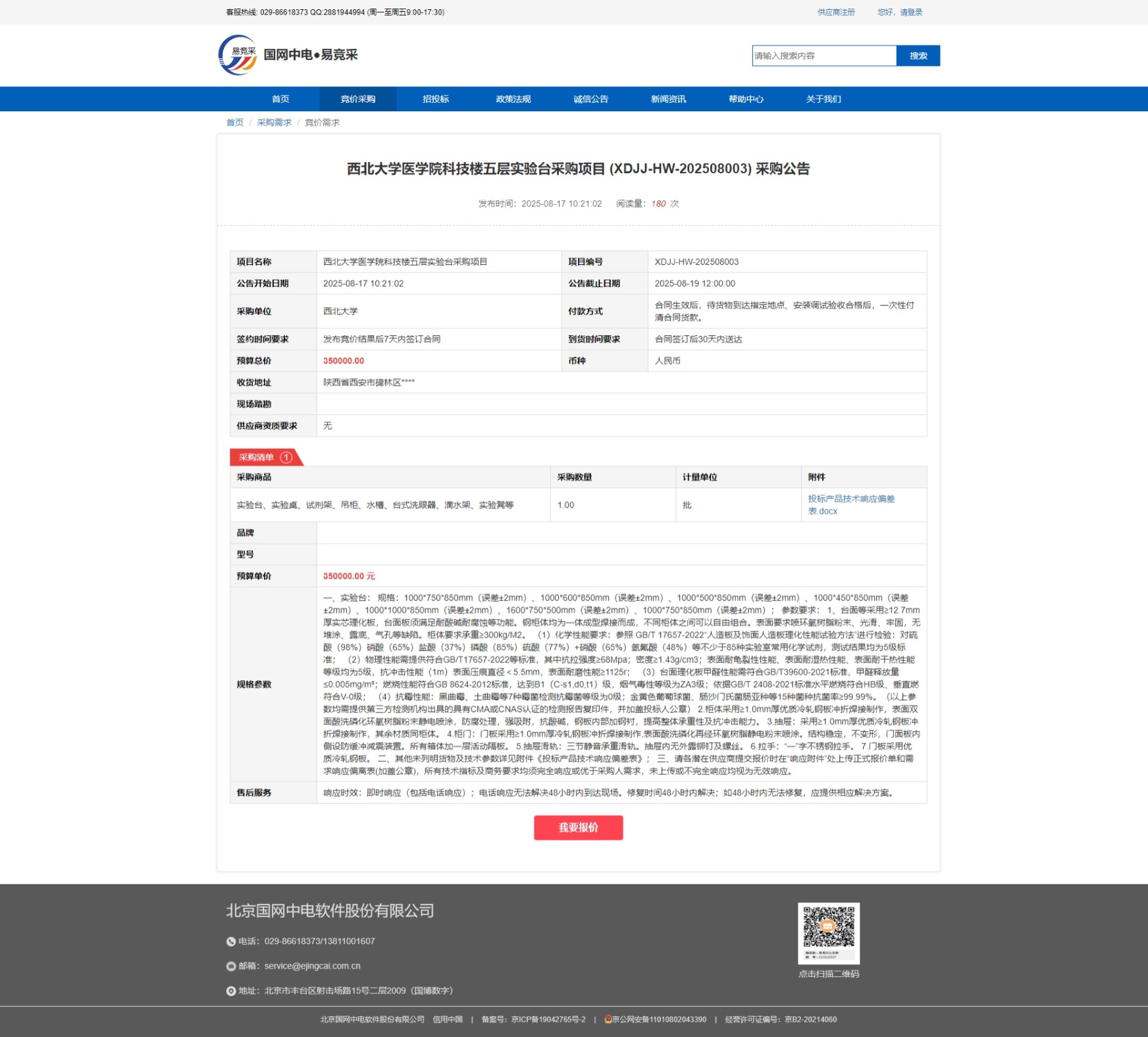 大阳城游戏【中国】官方网站医学院科技楼五层实验台采购项目 (XDJJ-HW-202508003)竞价 采购公告