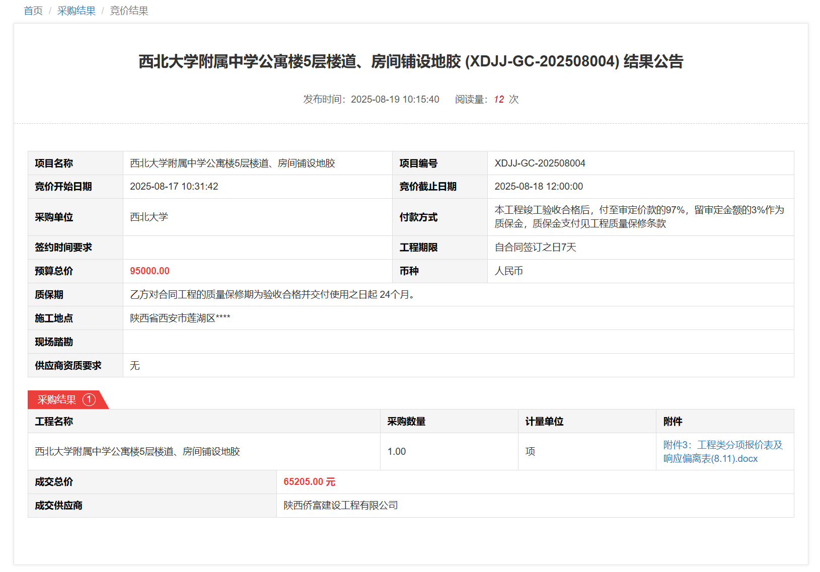 大阳城游戏【中国】官方网站附属中学公寓楼5层楼道、房间铺设地胶(XDJJ-GC-202508004)竞价结果公告