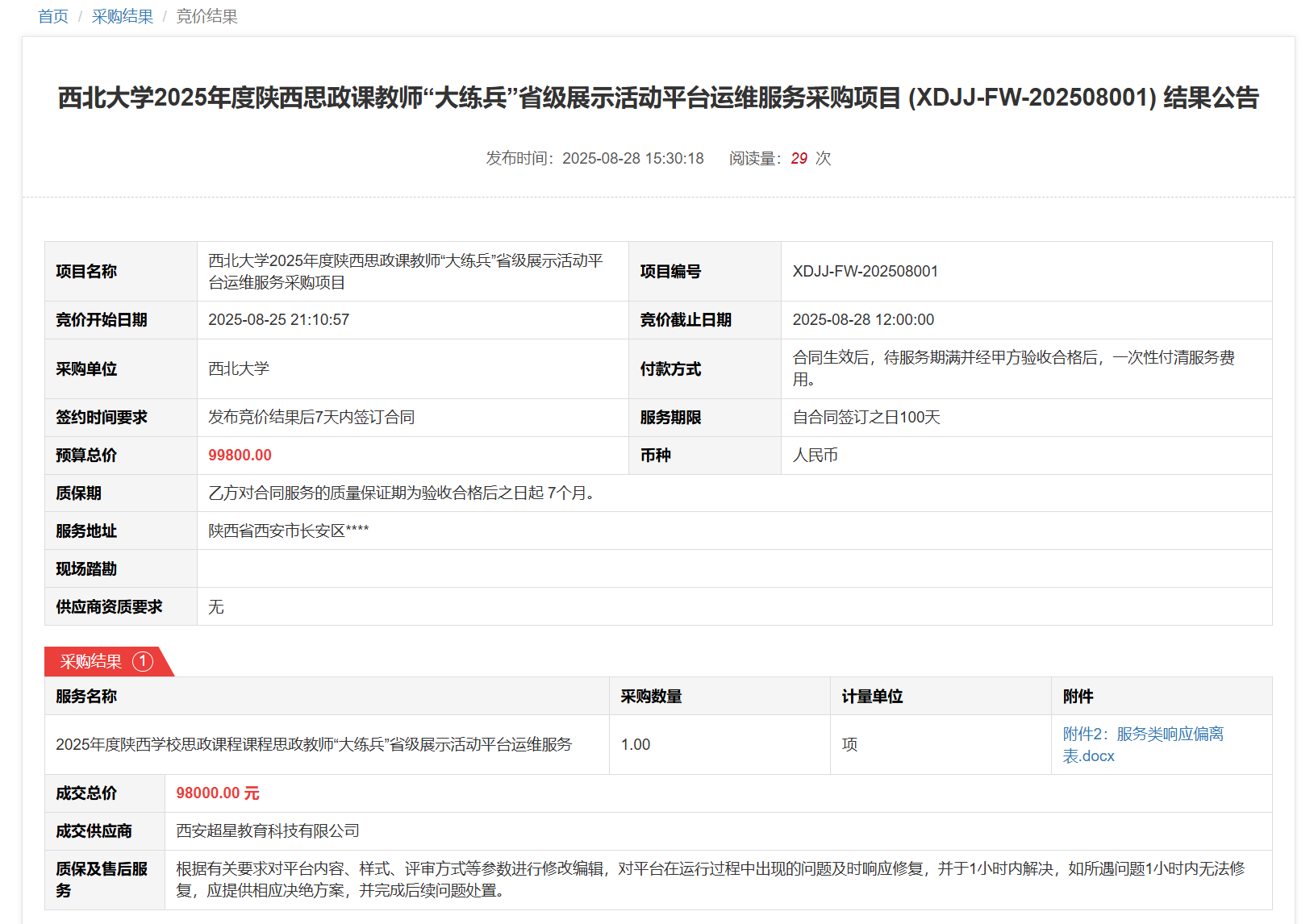 大阳城游戏【中国】官方网站2025年度陕西思政课教师“大练兵”省级展示活动平台运维服务采购项目(XDJJ-FW-202508001)竞价结果公告