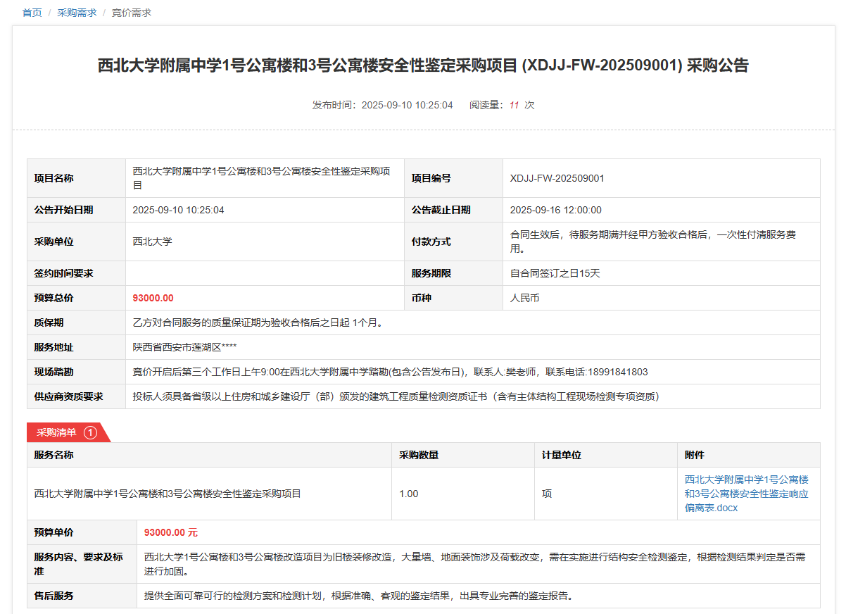 大阳城游戏【中国】官方网站附属中学1号公寓楼和3号公寓楼安全性鉴定采购项目(XDJJ-FW-202509001)竞价采购公告