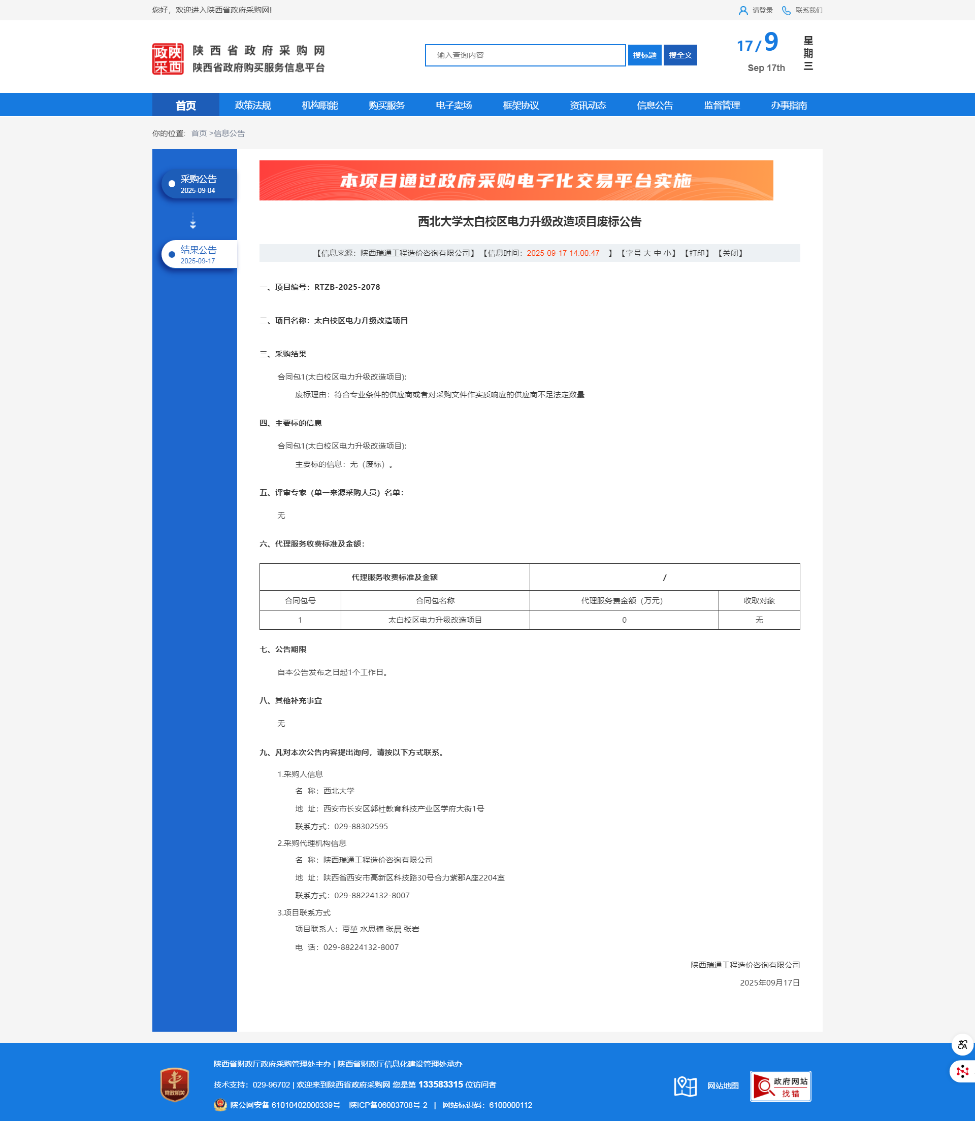 大阳城游戏【中国】官方网站太白校区电力升级改造项目废标公告