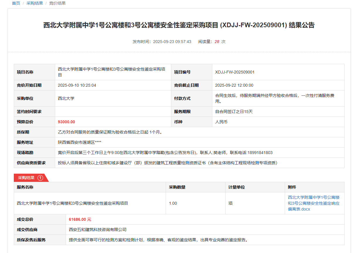 大阳城游戏【中国】官方网站附属中学1号公寓楼和3号公寓楼安全性鉴定采购项目(XDJJ-FW-202509001)竞价结果公告