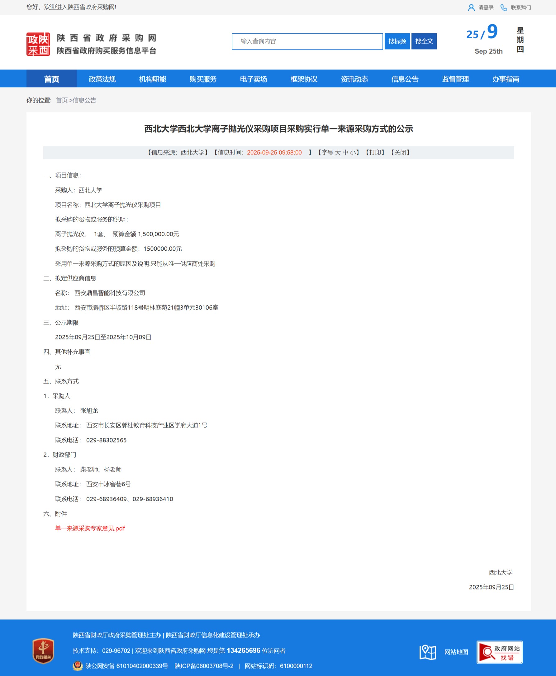 大阳城游戏【中国】官方网站离子抛光仪采购项目实行单一来源采购方式的公示