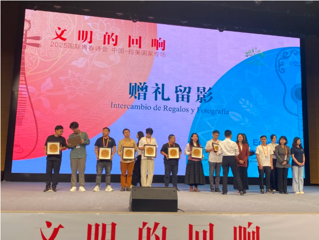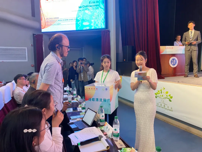 诗人们在舞台上挥毫泼墨的时候,舞台下正在进行一场诗歌的传递。在活动开始之前,主办方策划了诗歌明信片漂流环节。学生领取空白明信片,写下自己的短诗或喜欢的诗句,签名后投入“漂流邮筒”。来到活动现场的14位拉美国家青年诗人和12位中国诗人代表从“漂流邮筒”中抽取诗歌明信片。一首首诗从邮筒中“漂流”到诗人的掌心,见证诗歌与诗歌最温暖的相遇。活动落幕,但诗歌的漂流不会停止,那些诗意的吟唱将沉淀为新的文化记忆,如同种子落入土壤,在未来的时光里生长出绵长的回响。