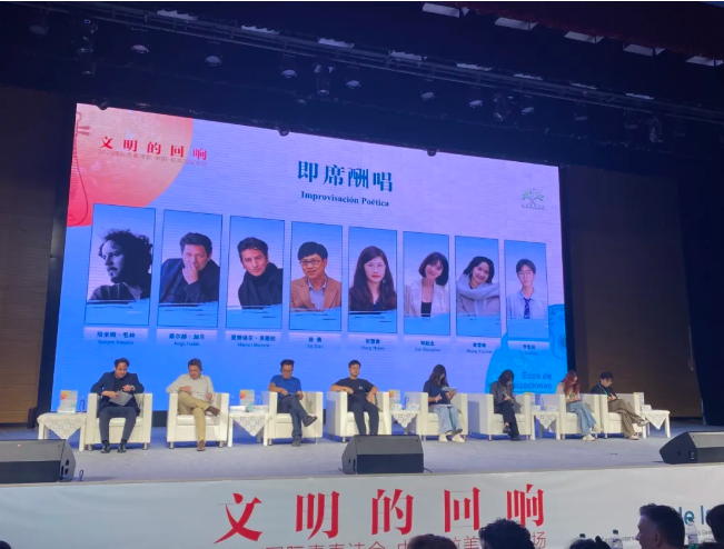 在即席酬唱环节,塔米姆·毛林(智利)、豪尔赫·加兰(萨尔瓦多)、曼努埃尔·贝塞拉(墨西哥)3位拉美诗人代表与徐萧、张慧君、邹胜念3位中国诗人代表,以及黄雪婵、李岩松两位校园诗人代表,以“土地”为题现场进行即兴创作。“我们的地平线就像雪一样尘土升起,蜜蜂在大地上飞舞”“我的感情里面有土地的弧度,我的话语里面有土地的年轮”“太阳倾听万物,目睹万象,月亮感知洞察万千的梦”“土地是道路的总和,但也为我们提供偶尔的一脚踏空”……不同年龄、不同性别、不同国度、不同语言,此时此刻的舞台中央,关于“土地”的诗歌组成了一片诗歌的土地,涌动的情感汇聚成诗人们对世界与生命的理解。
