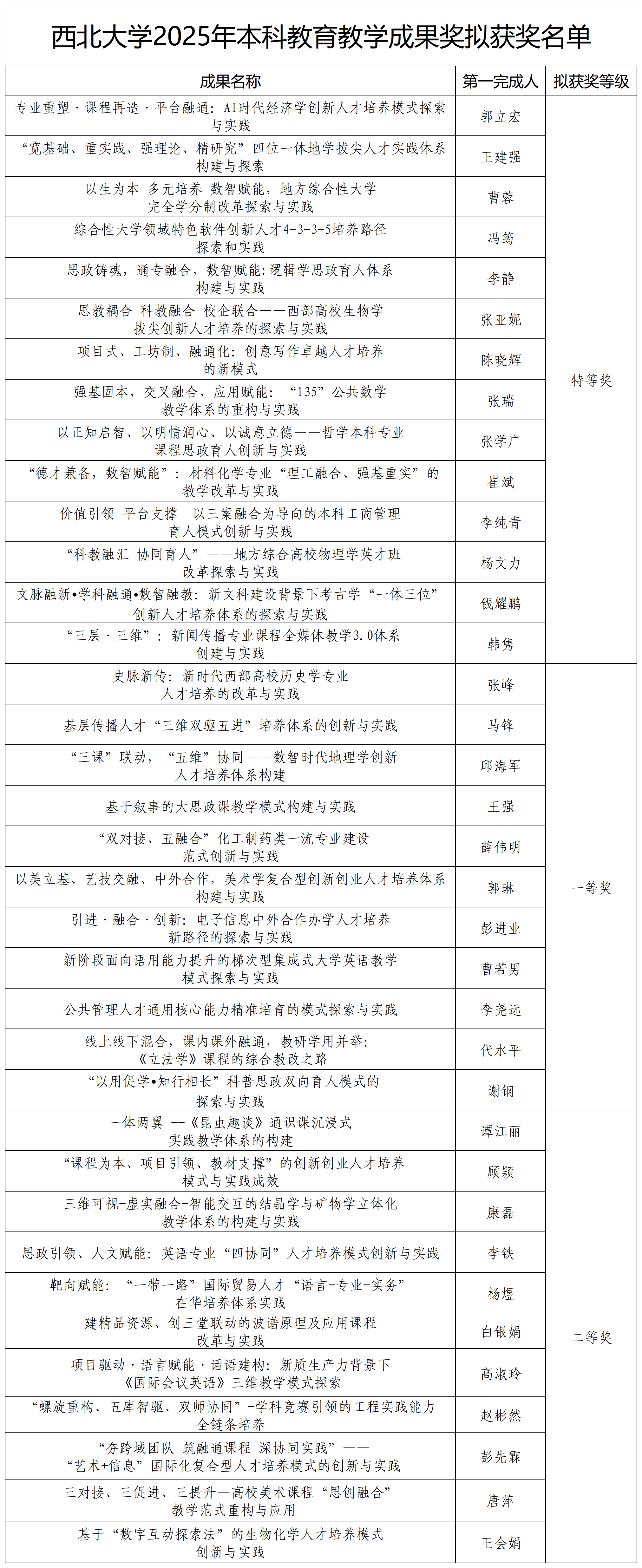 根据《大阳城游戏【中国】官方网站关于开展2025年本科教育教学成果奖评选工作的通知》(西大教〔2025〕19号)要求,经个人申报、单位推荐与专家评审,拟确定“专业重塑·课程再造·平台融通:AI时代经济学创新人才培养模式探索与实践”等14项成果获特等奖,“史脉新传:新时代西部高校历史学专业人才培养的改革与实践”等11项成果获一等奖,“一体两翼-《昆虫趣谈》通识课沉浸式实践教学体系构建”等11项成果获二等奖。同时,将依序推荐参加陕西省2025年本科教育教学成果奖评选。现将拟获奖名单予以公示,公示期为2025年9月8日-12日。公示期任何单位或个人有异议,请实名以书面形式向教务处反映。