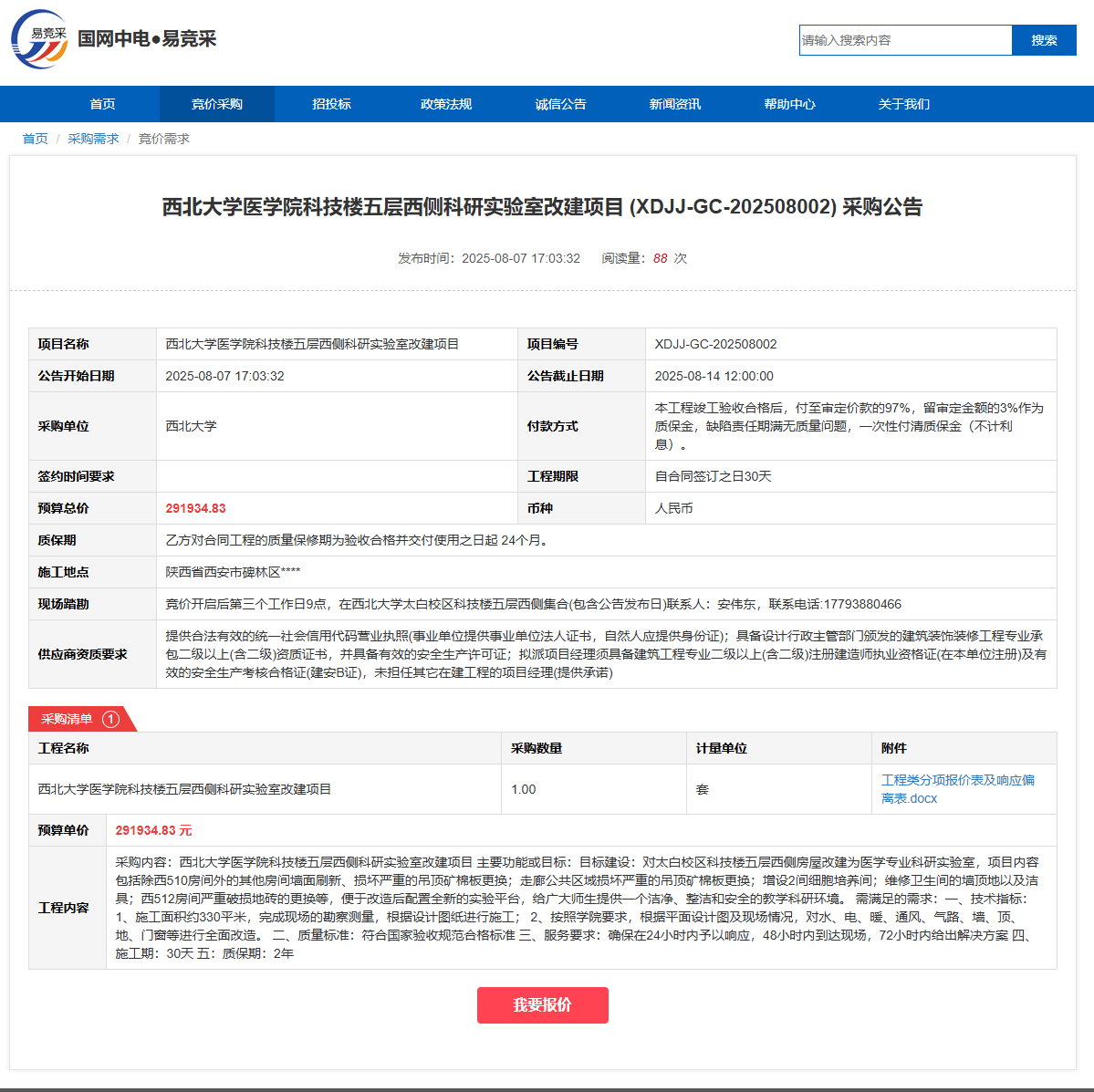 大阳城游戏【中国】官方网站医学院科技楼五层西侧科研实验室改建项目 (XDJJ-GC-202508002) 采购公告 作者: 编辑:党丹珩 时间:2025-08-08 公告地址:https://www.ejingcai.com.cn/site/bidding/detail/19914