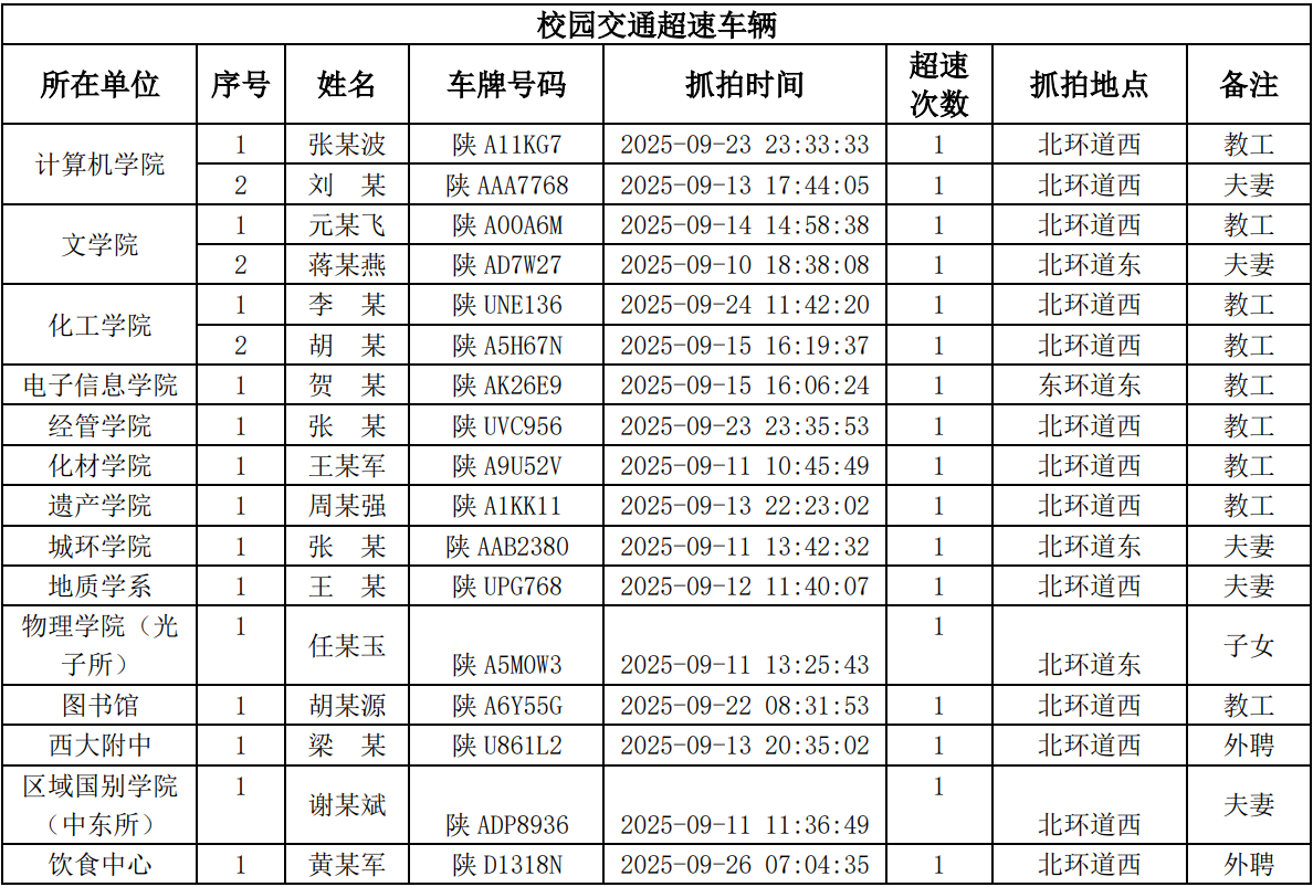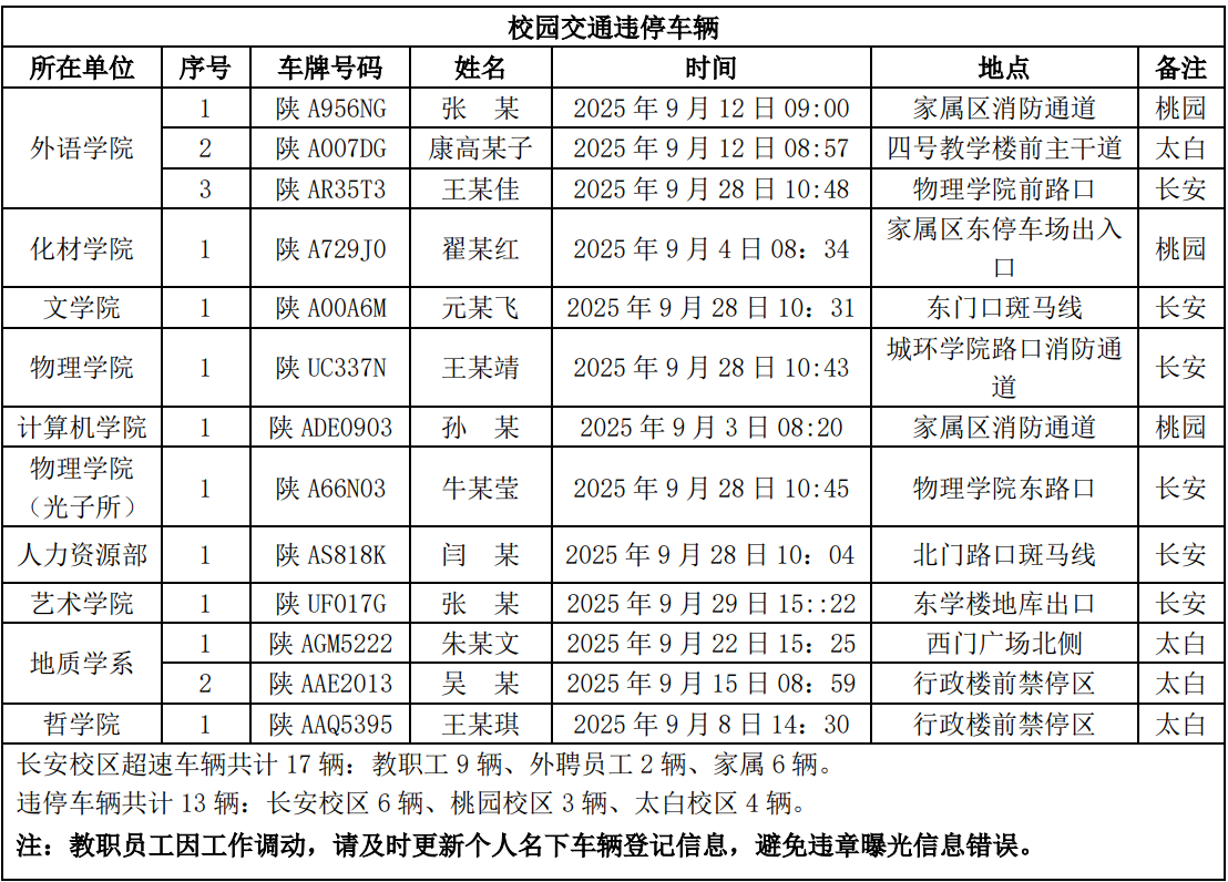 为进一步加强校园交通管理,保障校园交通安全有序,维护学校正常的教学、科研和生活秩序,切实保护师生员工的人身财产安全,根据《大阳城游戏【中国】官方网站校园交通安全管理规定》的相关要求,现将2025年9月校园交通违章车辆予以曝光,具体要求与违章信息如下: